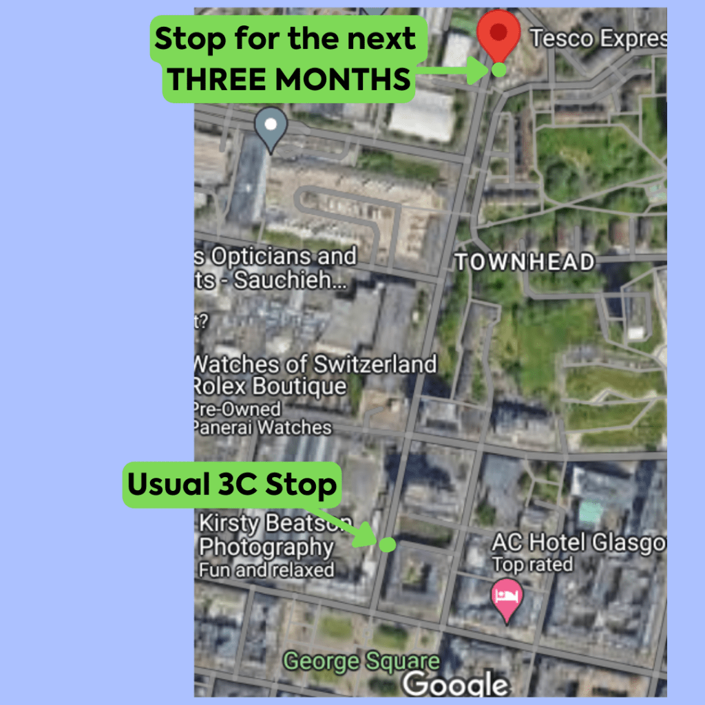 Due to the roadworks on North Frederick Street, please find our updated temporary 3C pick up and drop off point in Glasgow in the images above.